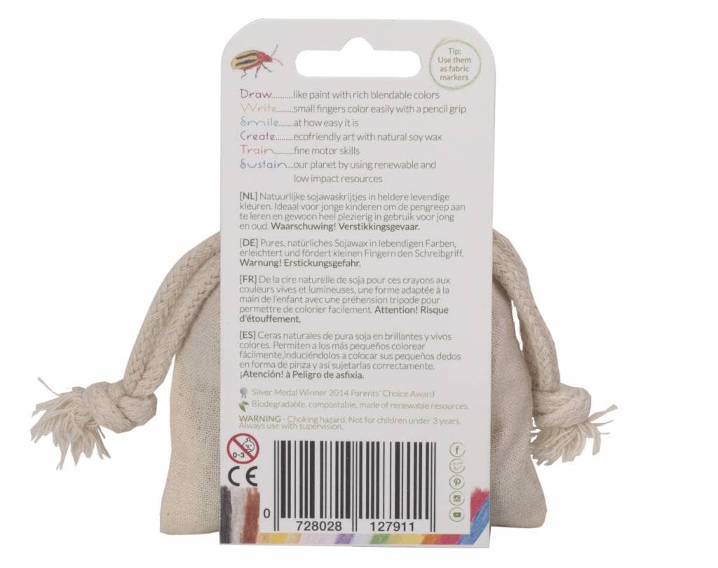 Eine coole Baumwolltasche mit 8 Grundfarben: Braun, Schwarz, Lila, Dunkelblau, Ocker, Rot, Orange und Grün. Die Sojawachsmalkreiden von Crayon Rocks® bestehen aus Soja und verleihen wunderschöne Farben. Ideal als erste Buntstifte für Kinder, da sie dazu anregen Daumen, Zeigefinger und Mittelfinger im richtigen Stiftgriff zu verwenden.