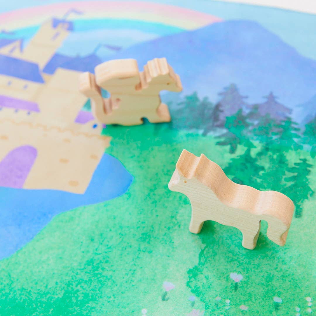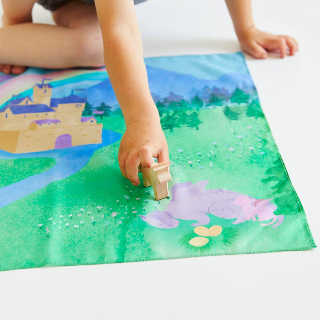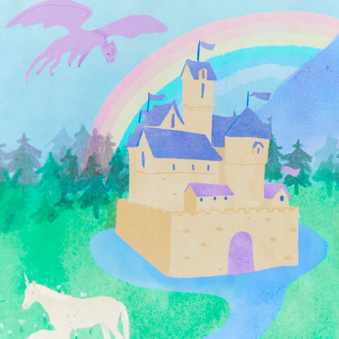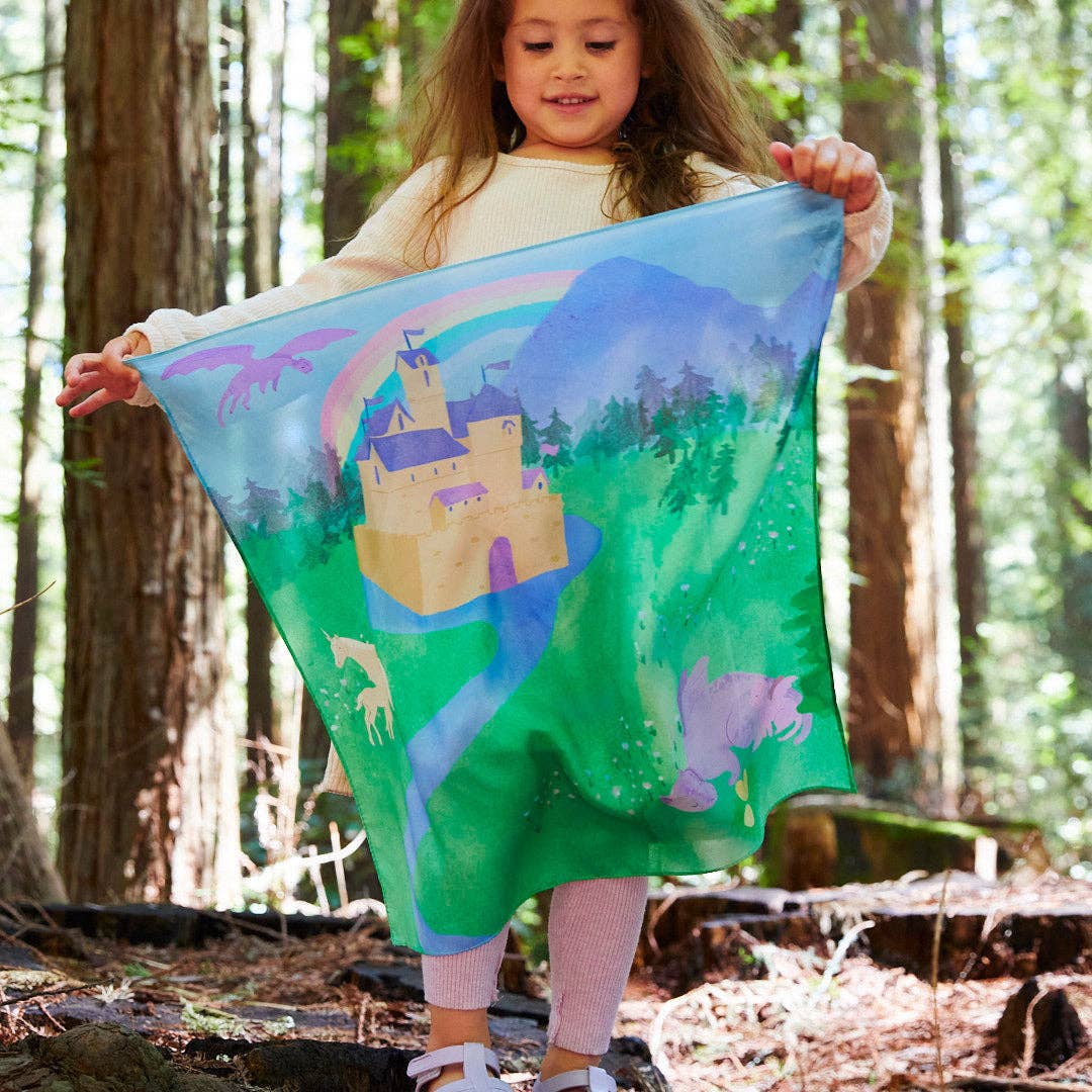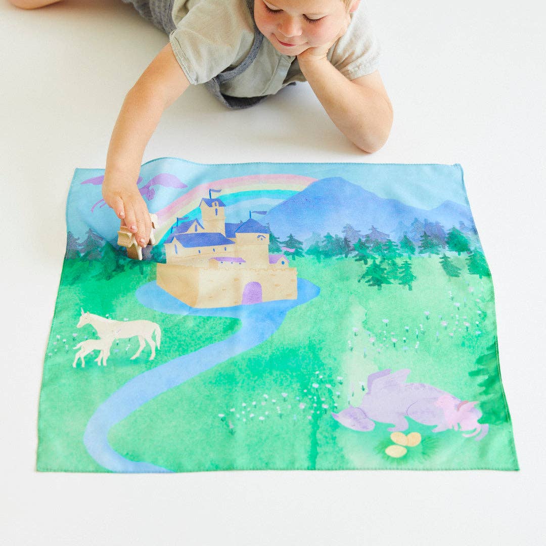 Limitierte Ausgabe Mini Playsilk, die ein Schloss-Wunderland unter dem Regenbogen darstellt. Die Playmaps von Sarah's Silk sind aus wunderschöner, 100% reiner Maulbeerseide, handbemalt und dann mit ungiftigen, umweltfreundlichen Farben bedruckt.
