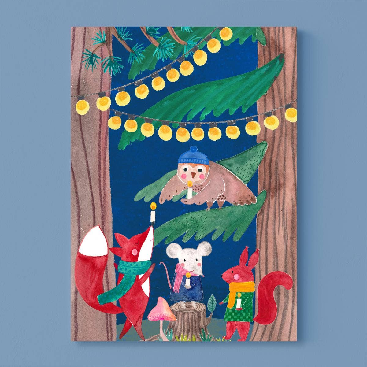 Postkarte mit Eule, Fuchs, Maus & Eichhörnchen.